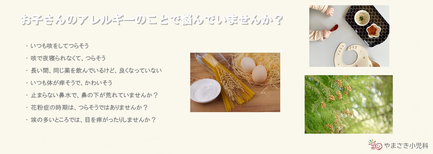 当院では通常の内服治療やスキンケアだけでなく、体質改善が期待できる舌下免疫療法(ダニ、スギ)、食物負荷試験まで幅広くアレルギー治療に対応しています。
